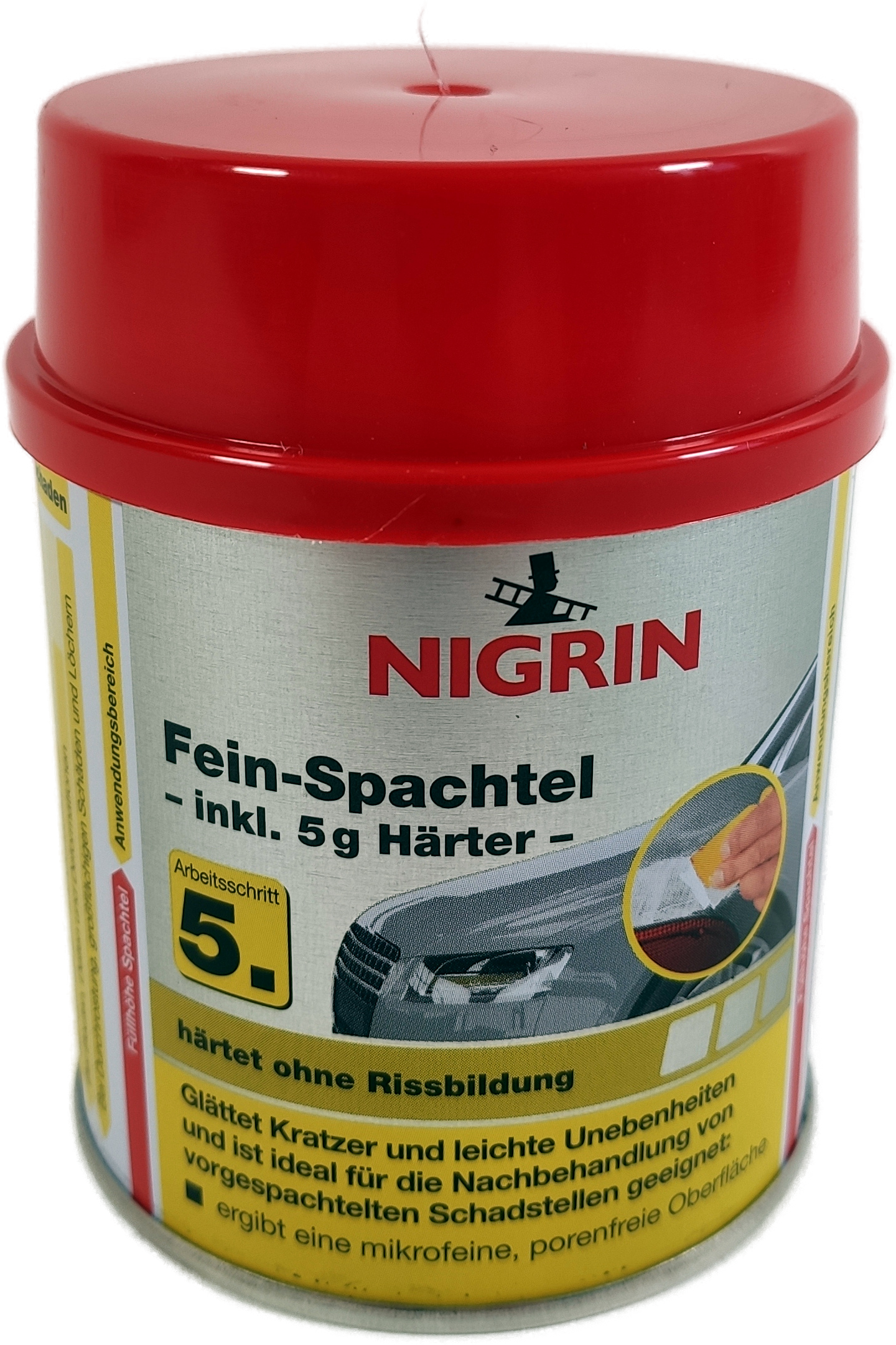 NIGRIN Fein-Spachtel ist ein schnell härtender Zweikomponenten-Spachtel auf Polyesterharz-Basis, der eine porenfreie, schleifbare Oberfläche ergibt.
