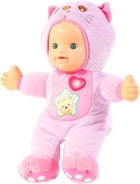 Ich bin eine süße Mietzekatze! *Süße Puppe im kuscheligen Katzenstrampler *Kätzchen-Taste löst lustige Lieder und Sätze aus und fordert zum Zahlen von 1 bis 5 auf *Leuchtende LED-Herz-Taste löst Melodien, Babygeräusche, Fragen und Sätze aus *4 gesungene Lieder *Die Zahlen von 1 bis 5 lernen *Kindersicheres Batteriefach und Abschaltautomatik *Demobatterien sind enthalten *ALter: 1-5 Jahre